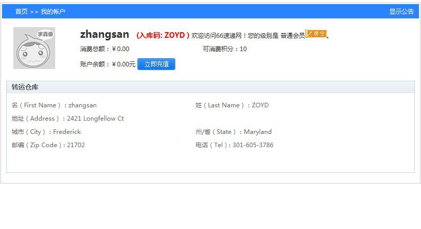 3、注册好之后,请先完善您的资料,完善资料之后,整个注册过程就完成了,您就能获得一个您专属的美国收货地址,就可以用这个地址去购物网下单了。