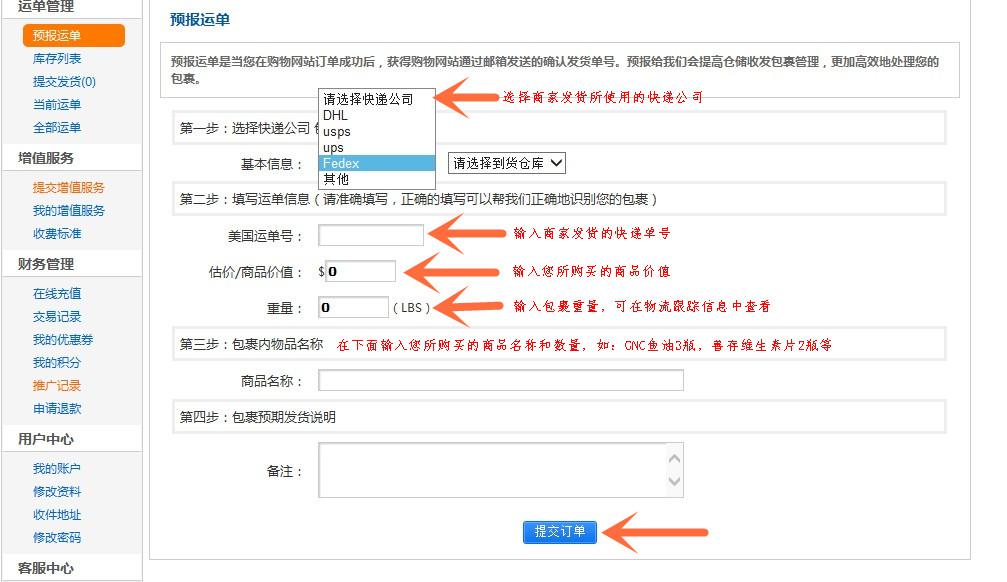 收到商家的发货邮件之后即可登陆您的帐户进行到货预报,填好所有信息之后点击“提交订单”完成到货预报。