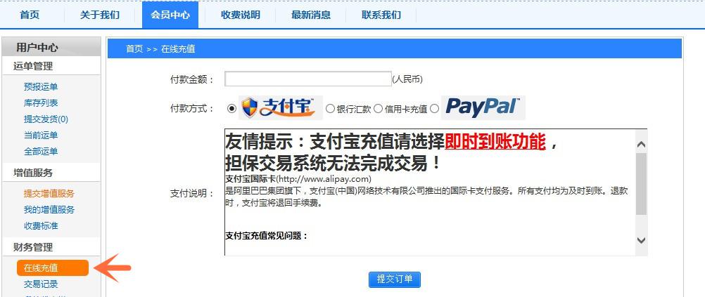 2、预充值运费,点击会员中心的“在线充值”,并且根据包裹重量预估运费,进行预充值。注:充值时请保证运费充足,以便能够及时发货;