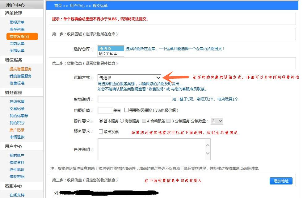 您的包裹入库之后,即可点击会员中心的“提交发货”进行发货处理。