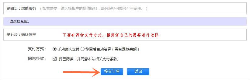 各项信息填写完整之后,选择好您的支付方式,点击“提交订单”即可完成发货